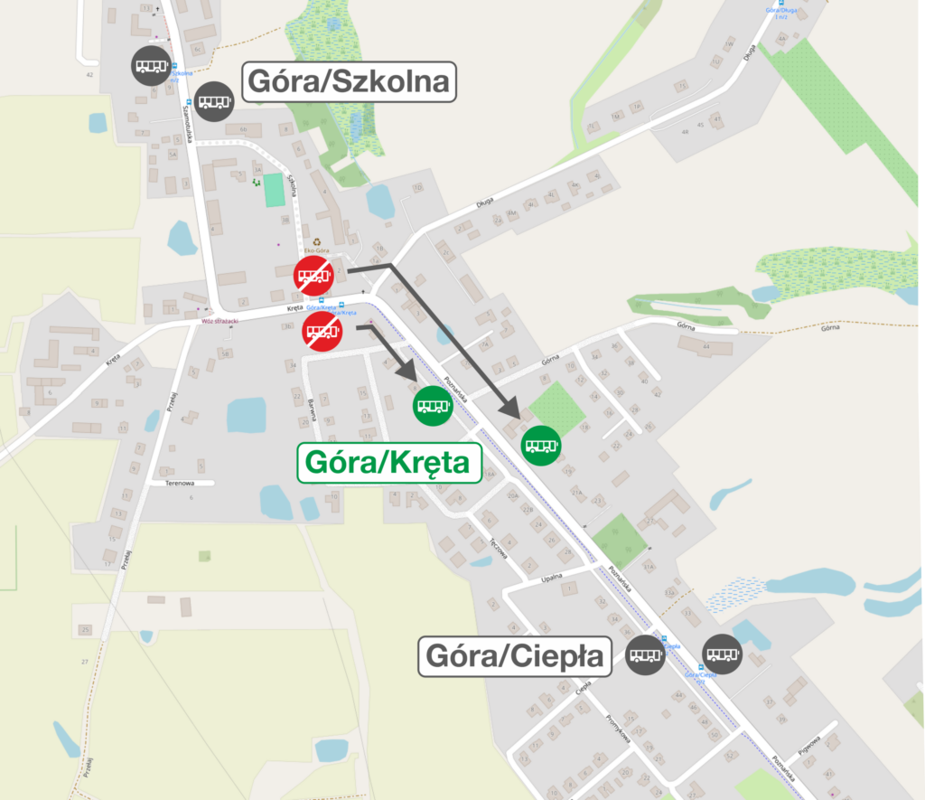 Przystanki na żądanie Góra/Kręta przy ul. Krętej zostaną wyłączone z użytkowania i przeniesione na ul. Poznańską. Zmiana obejmuje oba kierunki kursowania: