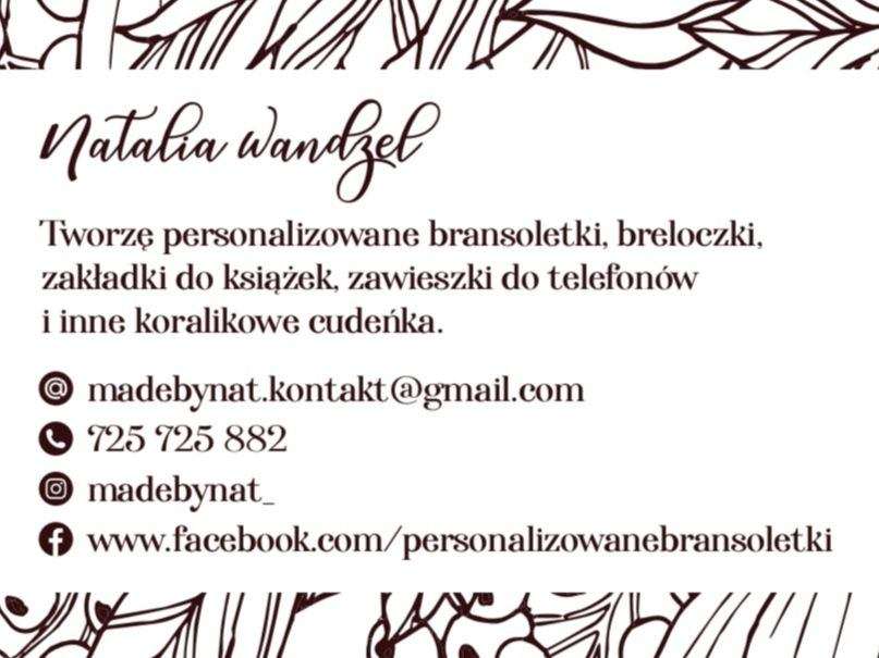 Jestem Natalia – mieszkanka Chyb, na co dzień żona i mama dwójki małych chłopców oraz inżynier kontroli jakości, a po godzinach rękodzielnik – twórczyni koralikowych cudeniek. Tworzę personalizowane bransoletki (koralikowe i sznurkowe), zawieszki do telefonów, zakładki do książek, breloczki, kolczyki, naszyjniki, pierścionki, komplety biżuterii oraz silikonowe zawieszki do smoczków.