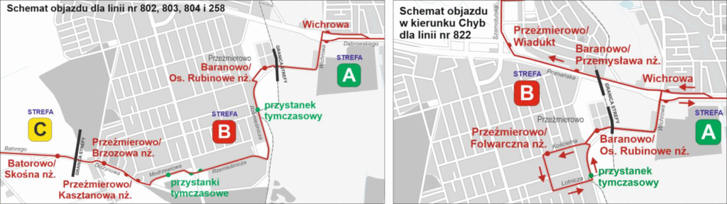 Dodatkowo autobusy linii nr 822 jadące w kierunku Poznania, na odcinku od ul. Kościelnej do ul. Rzemieślniczej, skręcą w ul. Kościelną, a tuż za skrętem zostanie ustawiony przystanek tymczasowy