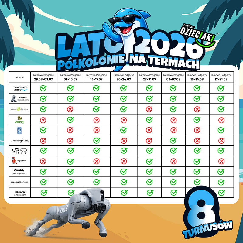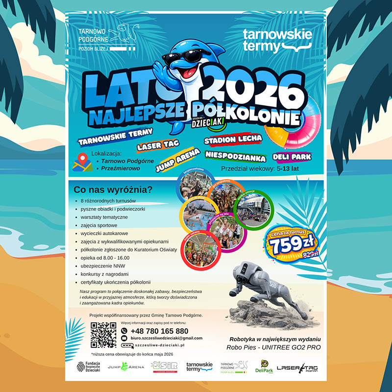 Trwają zapisy na Półkolonie Letnie 2026 „Szczęśliwe Dzieciaki”, które odbędą się w Tarnowie Podgórnym. Organizator zaprasza dzieci w wieku od 5 do 13 lat na wakacyjne turnusy pełne ruchu, zabawy i integracji. Zajęcia będą realizowane w nowoczesnym obiekcie Tarnowskie Termy, a każdy dzień przyniesie nowe aktywności i pozytywne emocje.