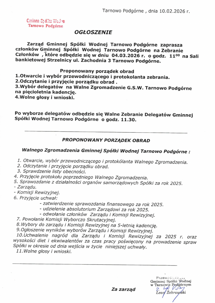 Bezpośrednio po wyborze delegatów, o godz. 11:30, odbędzie się Walne Zebranie Delegatów Gminnej Spółki Wodnej Tarnowo Podgórne.